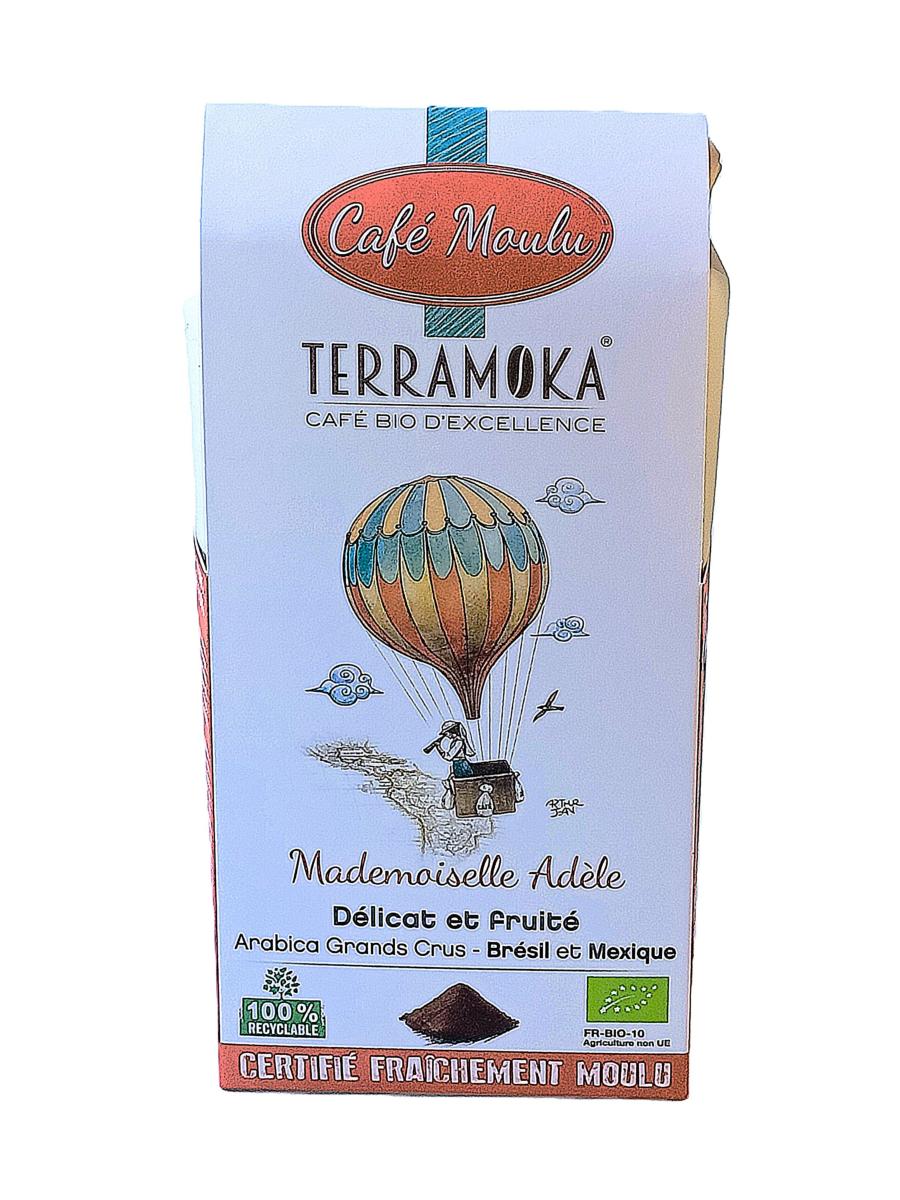 Découvrez un café d'excellence, café Terramoka, Arabica Bio Grand Cru du Mexique et Brésil, emballage 100% Bio-Dégradable. Ingrédient : café grand cru 100% arabica bio du Brésil et du Mexique. Poids net : 250 grs.