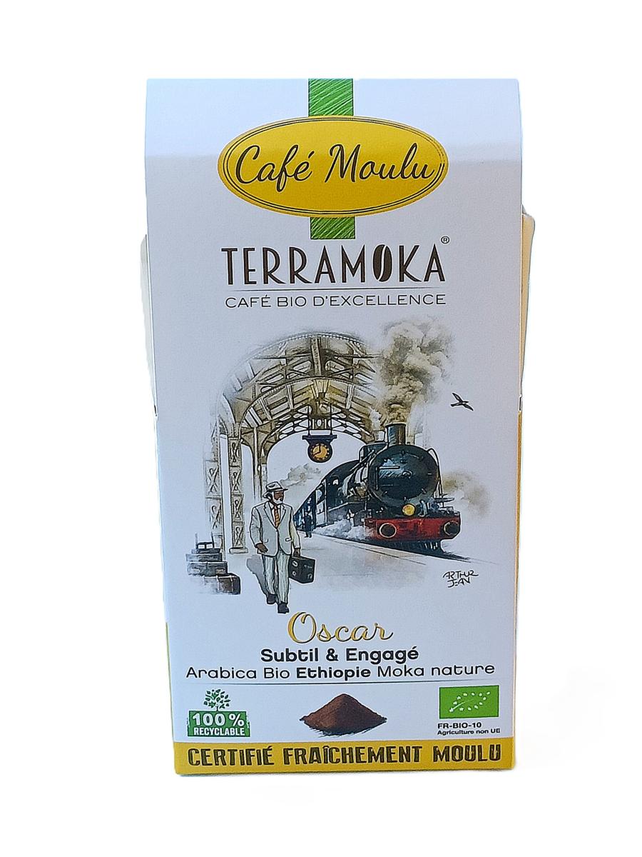 Découvrez un café d'excellence, café Terramoka, Ristretto Arabica Grand Cru Bio Ethiopie, emballage 100% Bio-Dégradable. Ingrédient : café grand cru 100% arabica Bio d' Ethiopie. Poids net du colis : 2,5 kg.