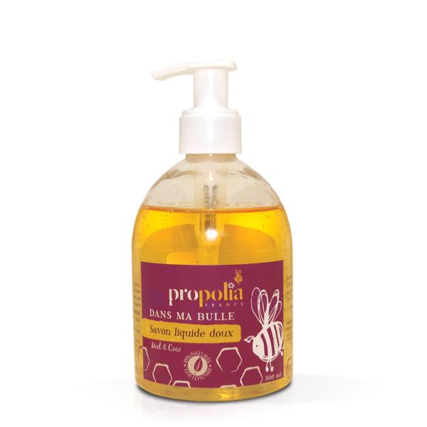 Savon Liquide à La Propolis Miel Coco pour l'hygiène du corps au quotidien. Proposé en flaçon plastique avec pompe distributrice, contenance 300 ml. Produit Français.